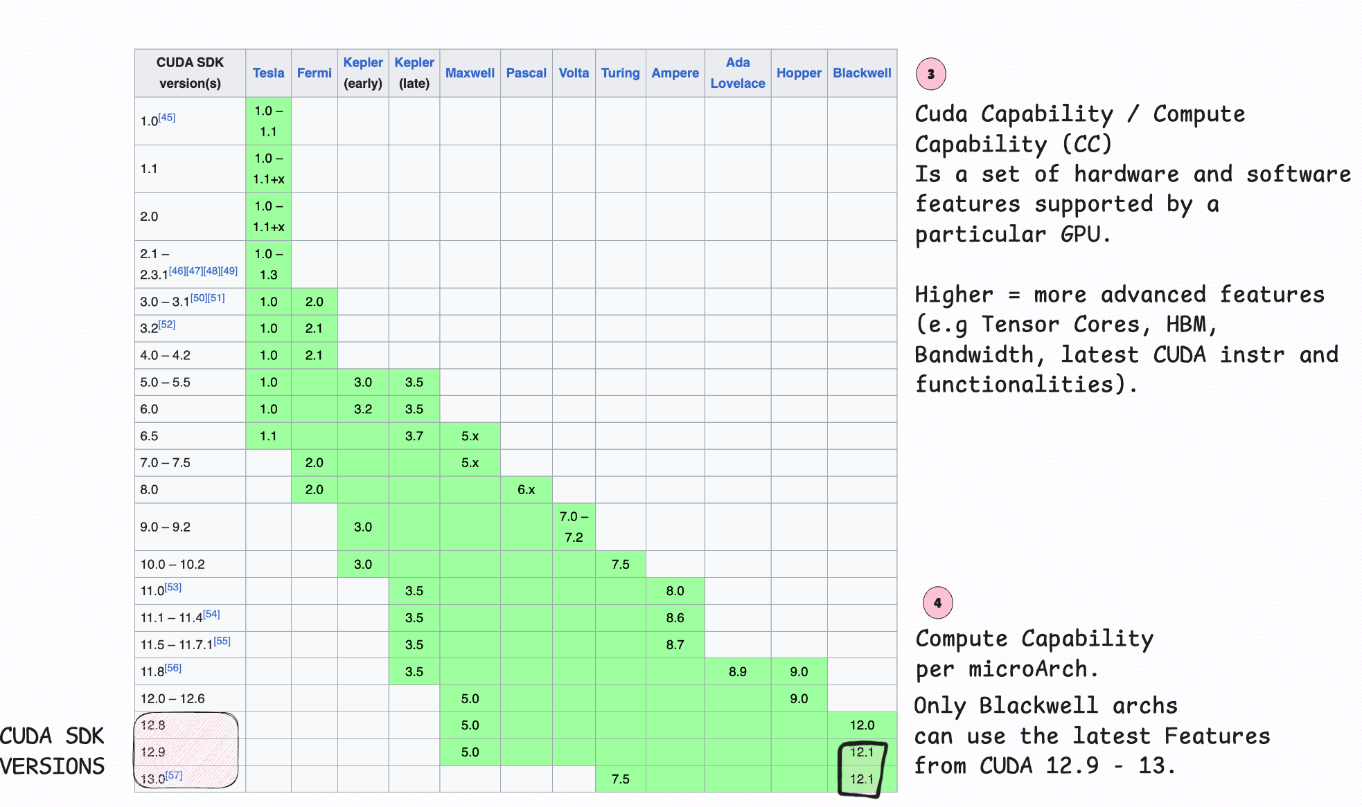 CUDA & library support - At some point, new CUDA features stop backporting to older CCs.