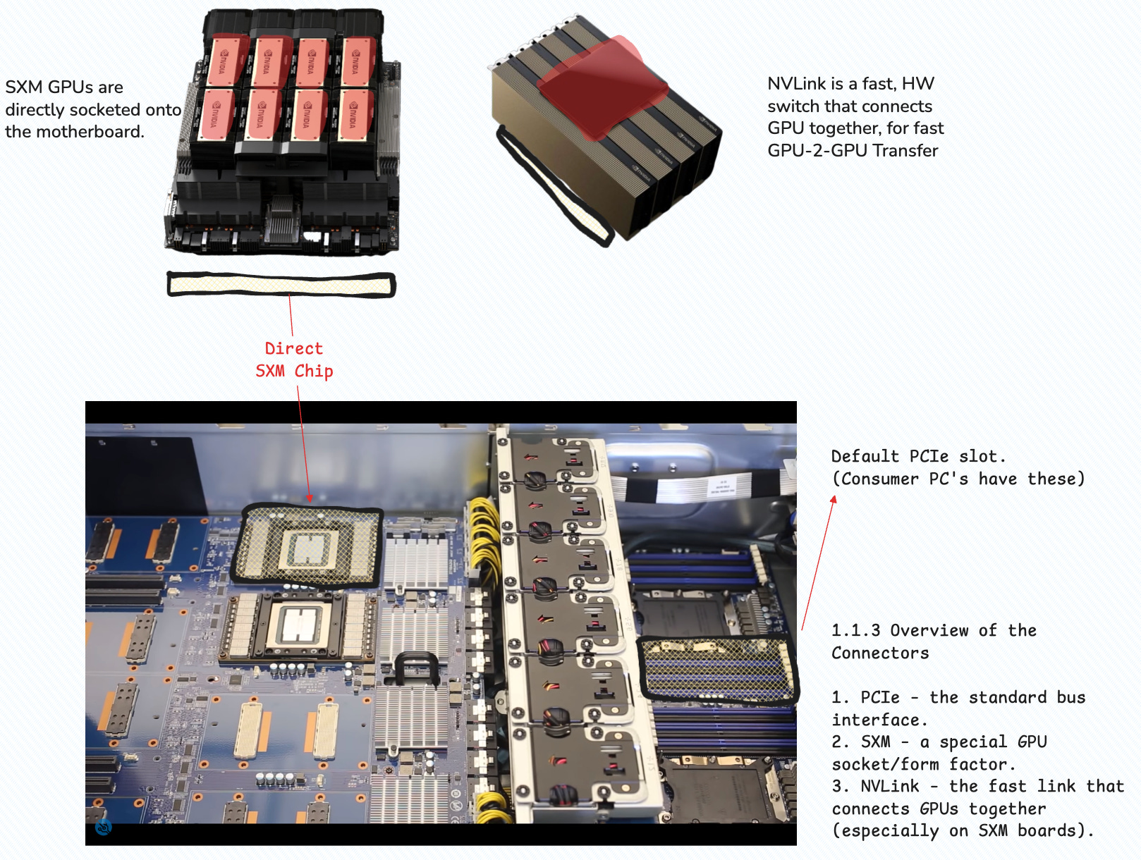 In the attached image, there is a Gaming PC Motherboard, featuring a PCIe 5.1 slot for the GPU, think RTX4080/4090/5090. On the other hand, SXM is a special chip embedded into the motherboard directly, and used in DataCenter clusters.