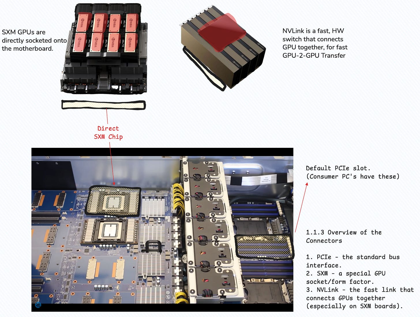 The key difference to make here is the connection interface, choosing between PCIe standard or SXM and NVLink, with the later being the go-to for large scale LLM training in distributed setups.