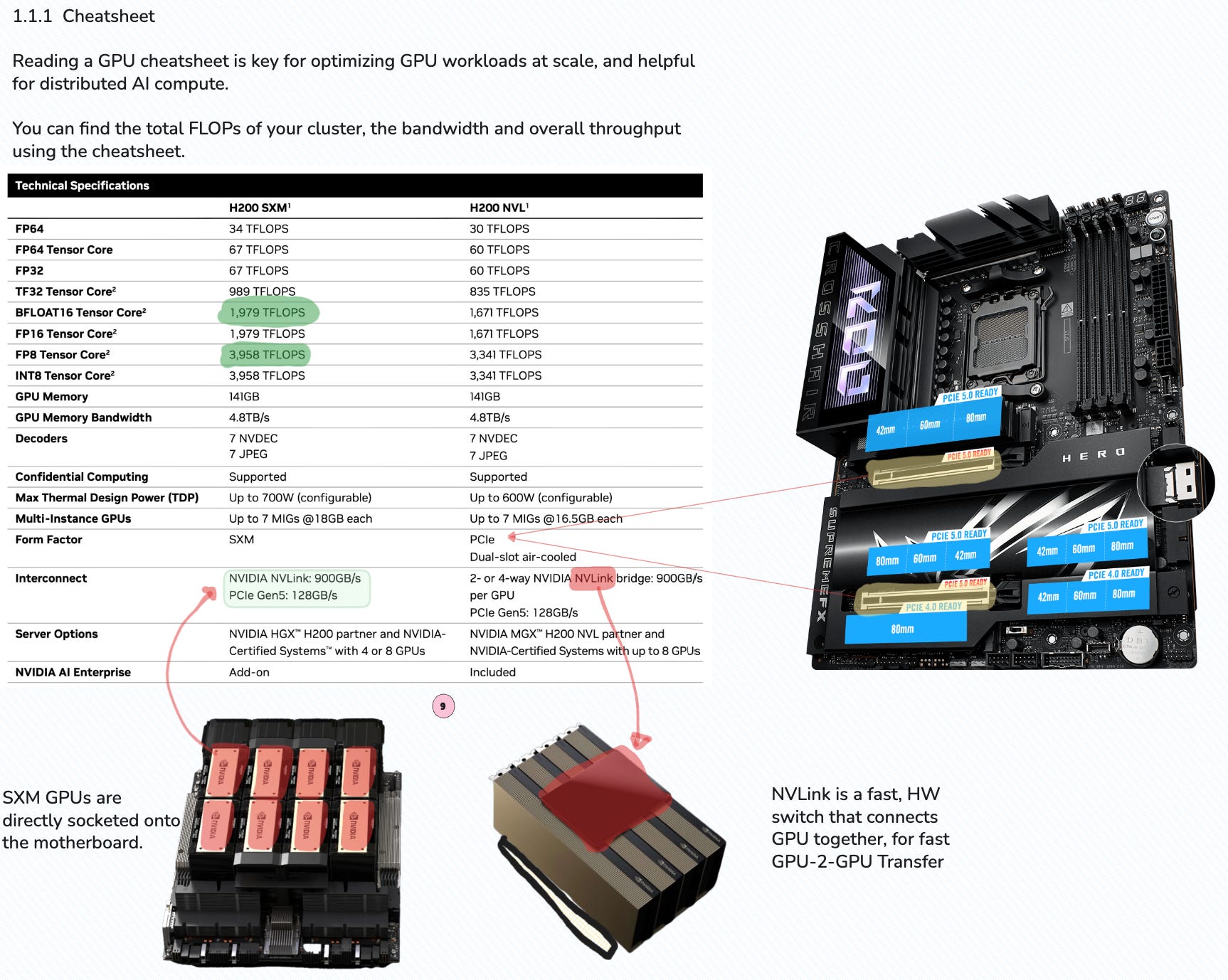 In the following image, let’s inspect the Technical Cheatsheet for the Hopper H200 GPU, covering a few key details on FLOPs and explain the difference between the form factors such as SXM or PCIe.