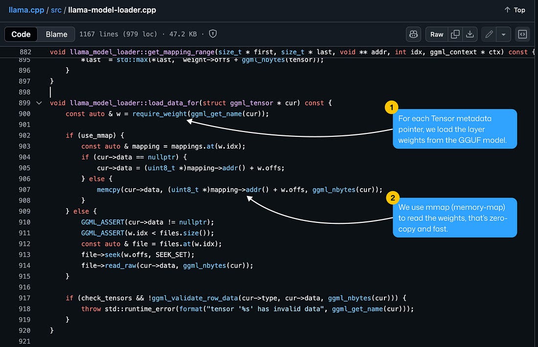 For each layer within the model graph, we’re loading the weights from the GGUF file using `mmap`, or Memory Mapping.