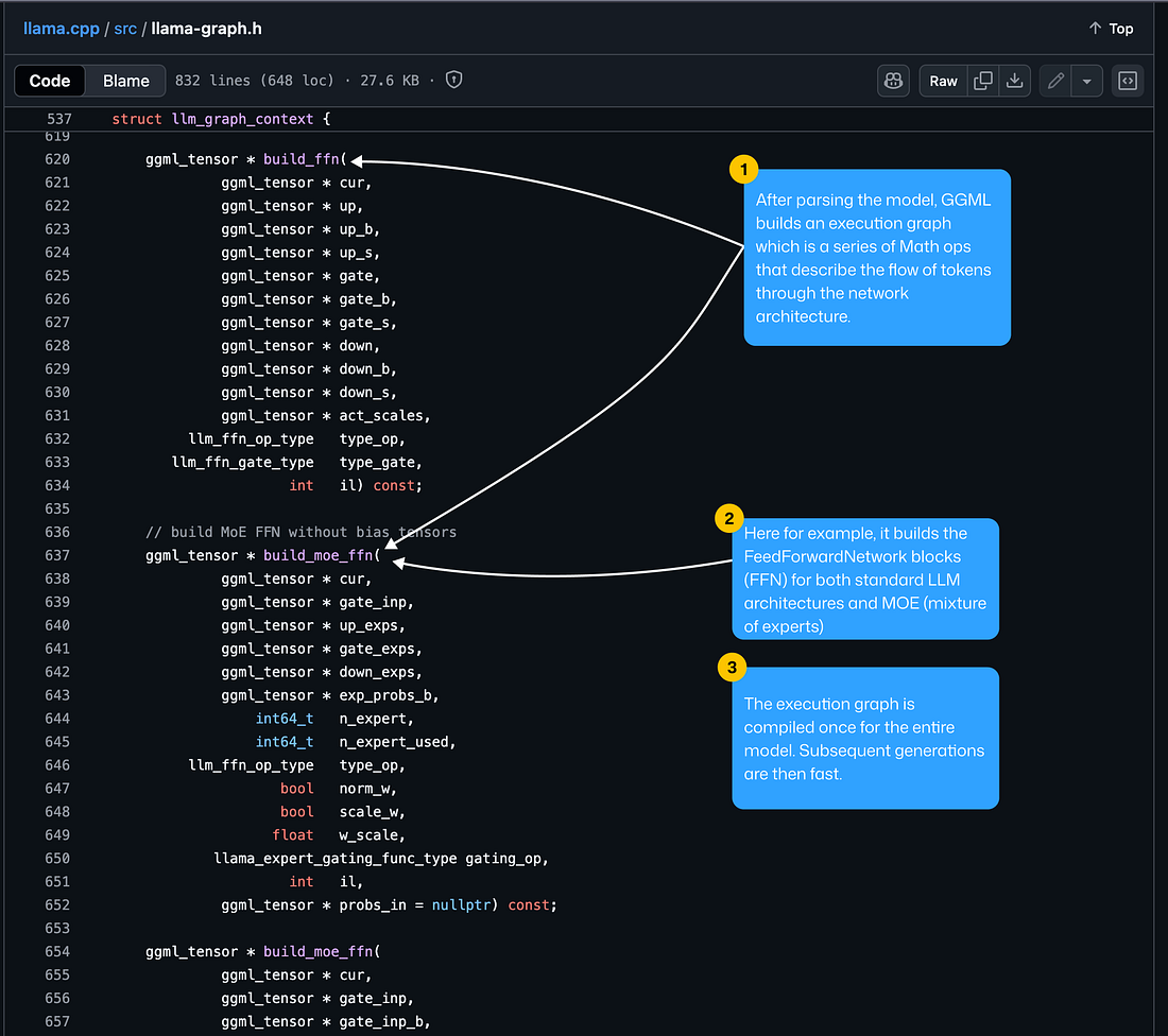 GGML [1] is the actual backbone, the core library that provides and executes all the tensor operations and provides all the optimizations necessary for high-performance computation, as it can be seen in the following sequence: