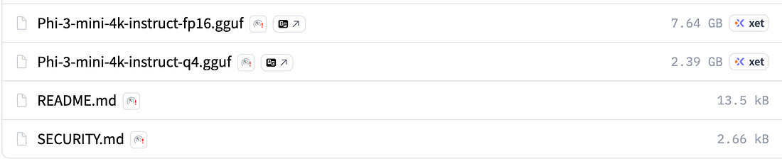 Let’s take the `microsoft/Phi-3-mini-4k-instruct` model as an example. It comes in 2 variants, an FP16 non-quant, and a Q4 GGUF quant.