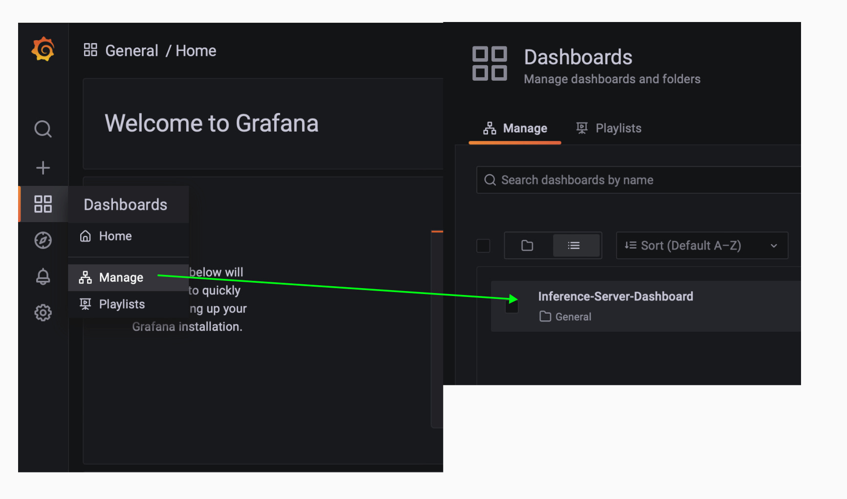 grafana: image: grafana/grafana-enterprise:8.2.0 container_name: grafana ports: - "3000:3000" volumes: - "./datasources:/etc/grafana/provisioning/datasources" - "./dashboards:/etc/grafana/provisioning/dashboards" environment: - GF_PATHS_PROVISIONING=/etc/grafana/provisioning - GF_AUTH_ANONYMOUS_ENABLED=true - GF_AUTH_ANONYMOUS_ORG_ROLE=Admin networks: - monitoring-networkWe mount both `./datasources` and `./dashboards` local folders to the grafana container such that it can load the existing data source (prometheus) and dashboards (perf_triton_dashboard.json). Port 3000 is the default.