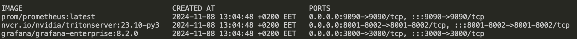 - targets: ['triton_server:8002']Each 15 sec, we will fetch a new set of time-stamped metrics from both of these services. We also added “self-scraping” such that we’ll have health metrics for the Prometheus service itself.