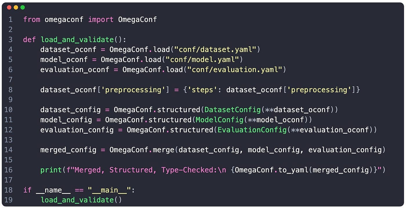 OmegaConf supports type-checking and validation through structured configurations, which are Python classes decorated with @dataclass. For more complex field validation workflows, we could use a Pydantic BaseModels workaround and serialize our config into a BaseModel, but for this example let’s pick the default dataclass approach for type-checking.