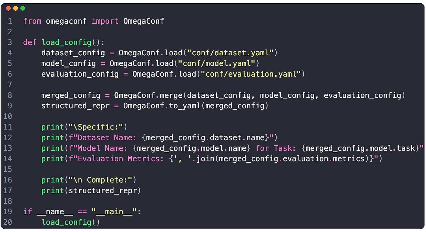 First, let’s define a basic file structure for our example, then define 3 configuration files for dataset, model, and evaluation followed by loading them using OmegaConf and accessing fields in a structured manner as specified in step 4.