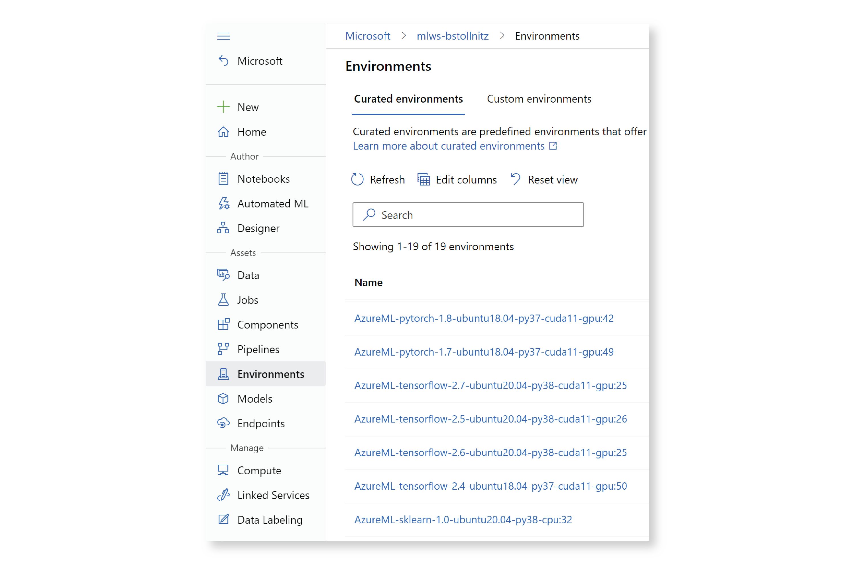 env = ml_client.environments.create_or_update(env)Furthermore, we could specify a `conda_file` argument when creating the Environment, and it’ll automatically build and version our custom Docker image. Once an environment is created, it’ll appear on the Environments tab in MLStudio UI.